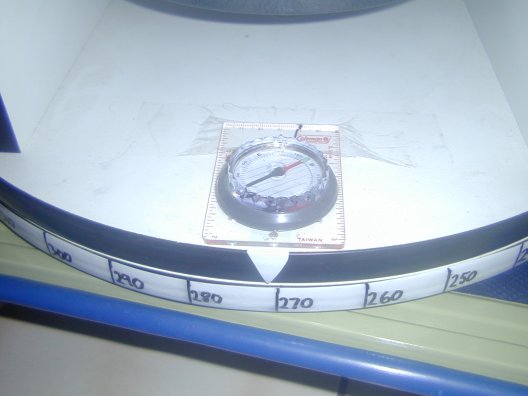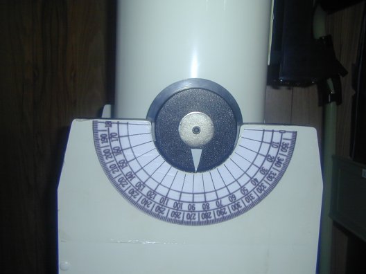 For starters all that is required to add an altitude circle to your telescope is a large protractor placed by the base and something on the telescope body to point at the protractor to an angle corresponding to the altitude of the telescope. I took a scan of a protractor, printed it on a sticker and stuck it to the base and covered it with contact (to protect against weather) as you an see below. I then added a pointer on the telescope using a triangle of PVC tape. The system seems to be accurate to within about 3 degrees when the telescope base is placed level.