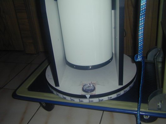 An azimuth setting circle is more time consuming but also quite cheap and easy to make. Dobsonian mounts are most often already circular. All that needs to be done is to accurately add markings to bottom part of the base with degrees marked off, and a pointer on the top half of the base. To make the marks removable, I first covered the bottom half of the base with white PVC tape. Accurate markings can only be made if you first use a tape measure to measure the diameter of the base and then divide by the number of markings you make. (I recomend 36 markings at 10 degree intervals). I also added a compass to the base (attached using only heavy duty sticky tape) to make alignment easy.
